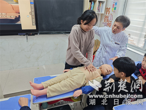 其中,六年级10班特意邀请了襄阳市第一人民医院护士家长,以“普及急救知识”为主题进行了讲座。课堂上,张护士细心地运用了配有丰富的教材和专业模型,系统讲解心肺复苏要点、急救流程等实用内容。在互动练习环节,张护士一步步指导学员们进行心肺复苏操作,并修改动作细节,让学员们亲身体验、掌握精髓。