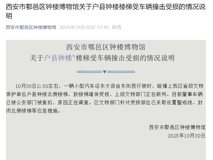 西安市鄠邑区钟楼博物馆10月30日发布声明。10月30日下午2点50分左右,一辆在东大街由东向西行驶的小车与该区省级文物保护单位户县钟楼北侧楼梯相撞,致使楼梯墙体受损。目前,高级文物部门正在开展调查。事故车辆已被公安部门扣押,目前事故原因正在调查中。区文化遗产办公室采取了紧急措施,包括在受损区域以北设置警戒线并关闭楼梯。上一条新闻: 年初10月30日上午,西安市回族区发生一起交通事故。一辆白色轿车与户县钟楼(又名户县钟楼)脚下的楼梯相撞,车头严重受损。事故现场(视频截图) 胡邑区文物管理局一名工作人员告诉吉姆新闻记者,30日凌晨,一名在钟楼工作的工作人员听到撞击声,发现一辆汽车撞上了钟楼北侧的楼梯。正如我们事先所知,楼梯栏杆移动了,栏杆下的墙壁被损坏。具体情况还需专家进一步调查评估。案发后,鄠邑区交警、文保办等部门介入调查。据官员介绍,游客和居民现在可以像往常一样通过爬南侧的楼梯进入钟楼。如果司机与建筑物相撞属于文化保护资产,他将负责补偿并保证后续修复。随后,文保部门将根据文保单位级别制定维修方案,由专门单位开展维修工作。户县钟楼(资料图)30日下午,记者从鄠邑区交警大队多个部门获悉,该大队事故科接到报警后介入,正在调查应对相关情况。交警团队一名警官表示,事故没有造成人员伤亡,事件正在处理中,相关情况正在上报。据公开资料显示,户县钟楼原名文昌阁,建于明崇正八年(1635年)。曾是户西县乃至全国的标志性建筑陕西省三级文物保护单位。这座建筑因其位于市中心而俗称“中塔”,又因其“仿照西安钟楼”而被称为钟楼。钟楼基座第一层为青砖砌成。楼阁二层重檐三滴水,四角尖塔,雕梁画栋,古朴典雅。钟楼内还设有胡乙钟楼博物馆。西安区钟楼综合博物馆回及往期报道